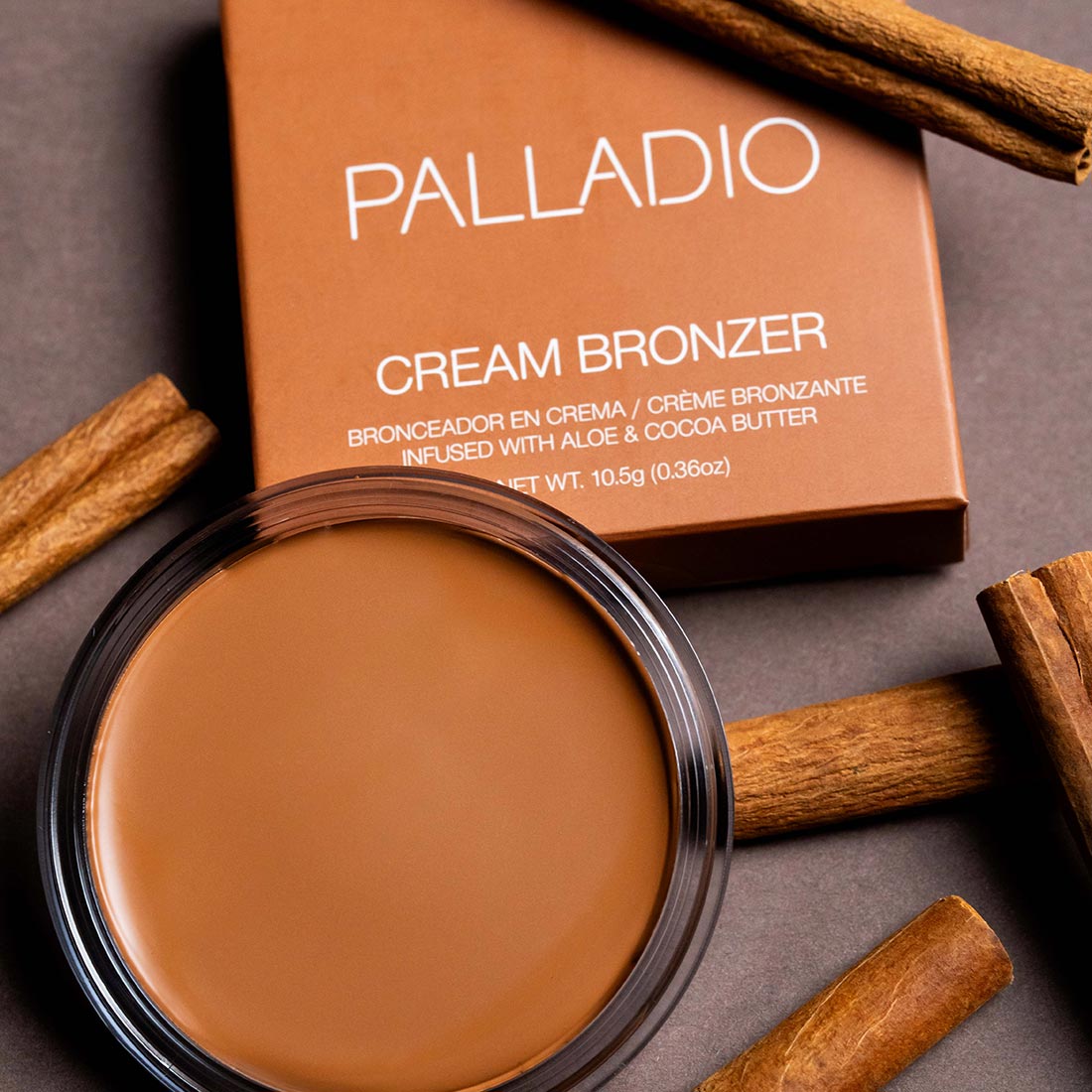 Palladio Cream Bronzer can be used on both bare skin and over foundation, providing a natural finish in either application.